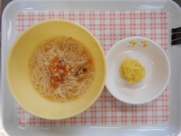 今日の献立は、にゅうめん、ポテトきんぴら、みかんです。離乳食(後期)は具だくさんにゅうめん、ポテトきんぴら、さつま芋スティック、大根スティック、ミニゼリーです。離乳食(中期)は具だくさんにゅうめん、さつま芋マッシュです。