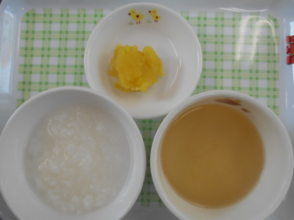 今日の献立は、きつねうどん、さつま芋きんぴら、みかん、チーズです。アレルギー食(乳)はチーズなしです。離乳食(後期)はおかゆ、さつま芋マッシュ、スープです。