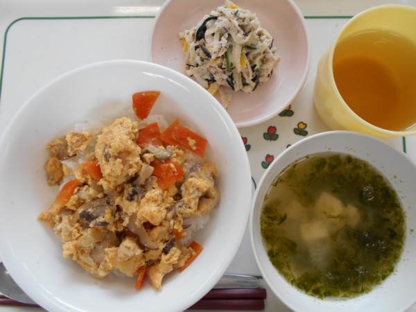 今日の給食は親子丼、切干大根サラダ、あおさの味噌汁です。アレルギー食(卵)の親子丼は卵除去、サラダは卵不使用のマヨネーズ使用です。離乳食(初期)はおかゆ(粒あり)、豆腐、じゃが芋、人参の刻み、うわずみです。