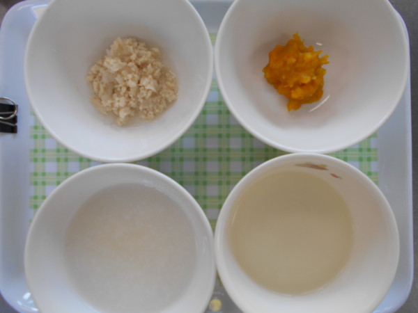 今日の給食はご飯、豚肉の甘じょうゆ焼き、カラフルサラダ、かぼちゃのみそ汁です。離乳食(初期)はおもゆ、人参ペースト、うわずみです。離乳食(中期)はおかゆ(粒あり)、ささみと大根の煮物、かぼちゃときゅうりのサラダ、うわずみです。