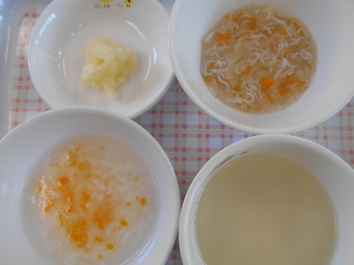 離乳食(中期)は、人参粥、うわずみ、しらすと野菜のあんかけ煮、じゃが芋マッシュです。