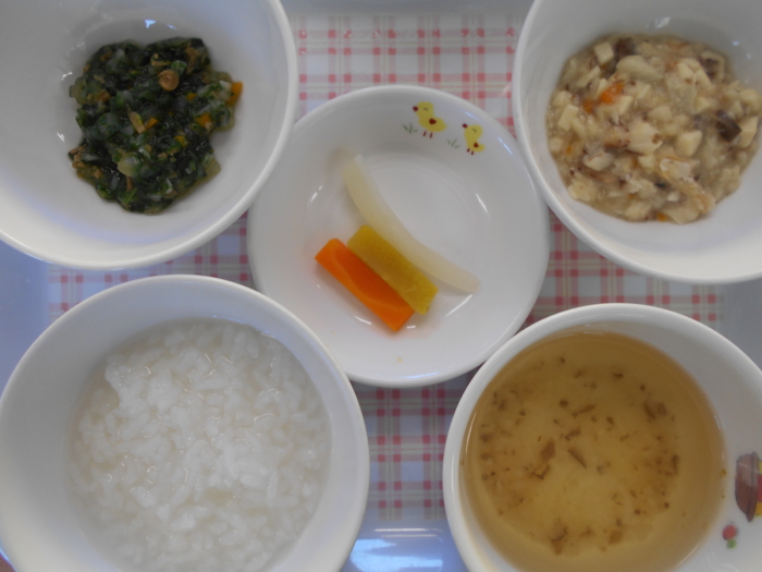 離乳食(後期)は、全粥、サバの味噌煮、ほうれん草のなめ茸和え、そうめん汁、人参スティック、さつまいもスティック、キャベツスティックです。
