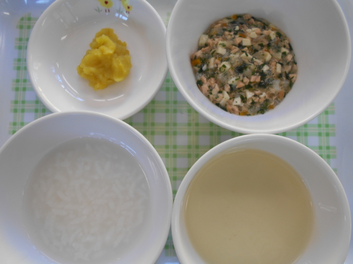 離乳食(中期)は、7倍粥、うわずみ、鮭と豆腐のとろとろ煮、さつまいもマッシュです。