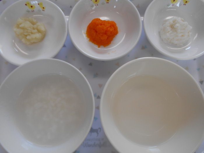 離乳食(初期)は、粒あり粥、野菜スープ、人参(粒あり)、カレイ(粒あり)、さつまいも(粒あり)です。