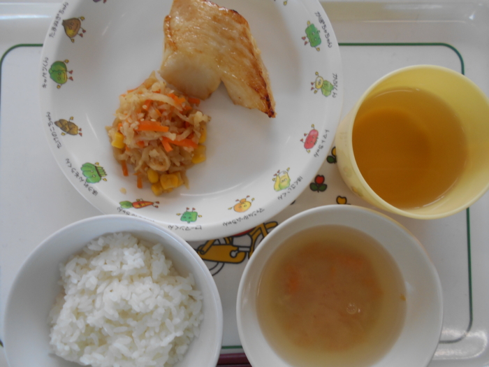 今日の給食は、ごはん、カラスカレイの照り焼き、切干大根のナムル、えのきの味噌汁です。