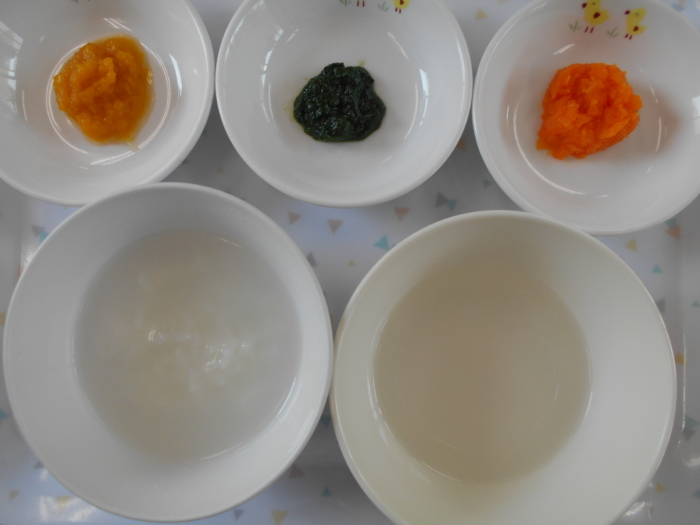 離乳食(初期)は、粒あり粥、野菜スープ、かぼちゃ(粒あり)、人参(粒あり)、ほうれん草(粒あり)です。