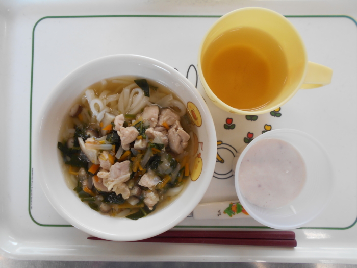 今日の給食は、鶏塩うどん、ブルーベリーヨーグルトです。