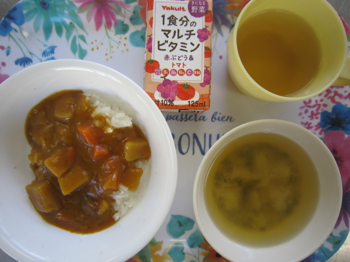 今日の給食は、ポークカレーライス、じゃが芋の味噌汁、野菜ジュースです。