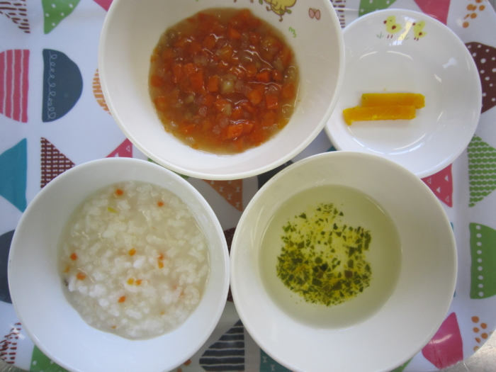 離乳食(後期)は、白身魚と野菜の煮込み粥、根菜の煮物、わかめスープ、南瓜スティックです。
