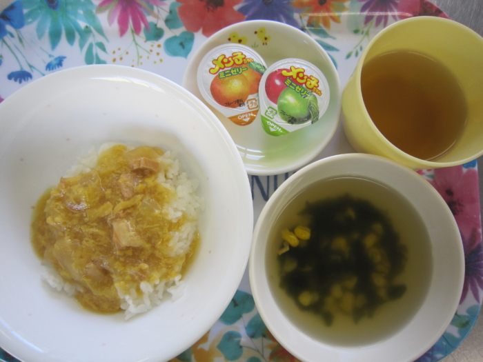 今日の給食は、親子丼、わかめスープ、ミニゼリーです。