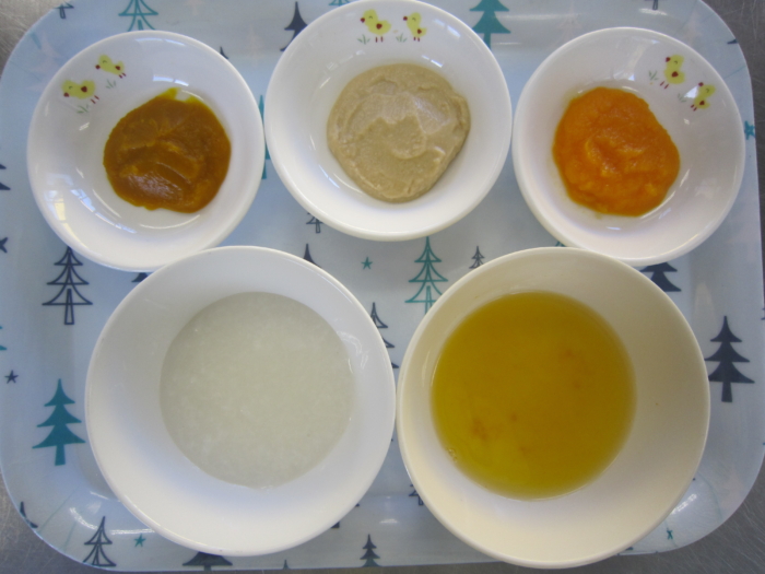 離乳食(初期)は、つぶし粥、南瓜ペースト、人参ペースト、大豆ペースト、野菜スープです。
