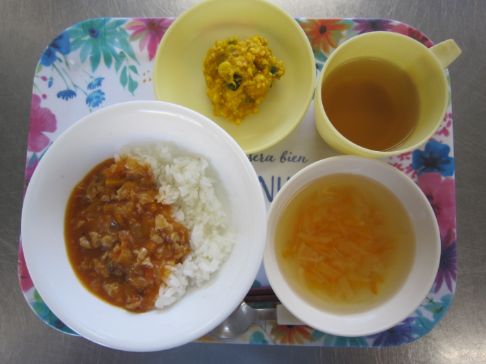 今日の給食は、ハヤシライス、南瓜とチーズのサラダ、人参スープです。