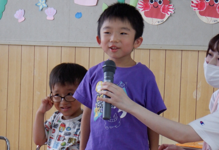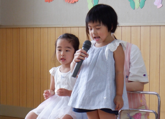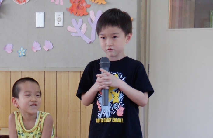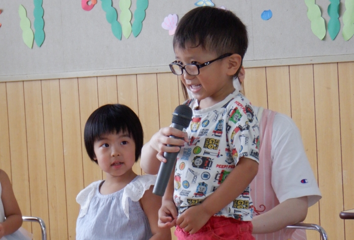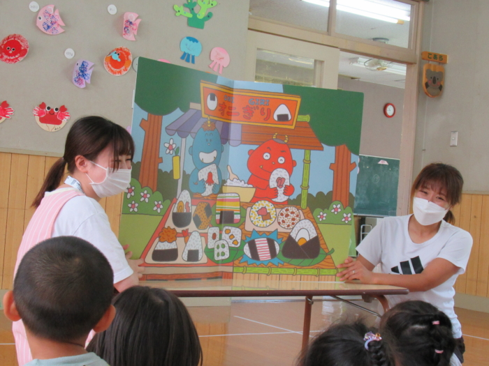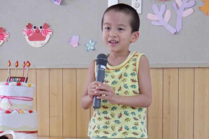 今日は、8月生まれのお友だちのお誕生会をしました。今月は、たくさんのお友だちが誕生日を迎えましたよ。お家の人たちもお祝いに来てくれて、誕生児さんたちは、嬉しい気持ちと、ちょっぴりドキドキした気持ちが入り混じっていたようです。先生たちからの出し物は、『赤オニぎり 青オニぎり』というジャンボ絵本。絵本の大きさに圧倒されていた子どもたちでしたよ。 また一つ大きくなったね。お誕生日、おめでとう‼