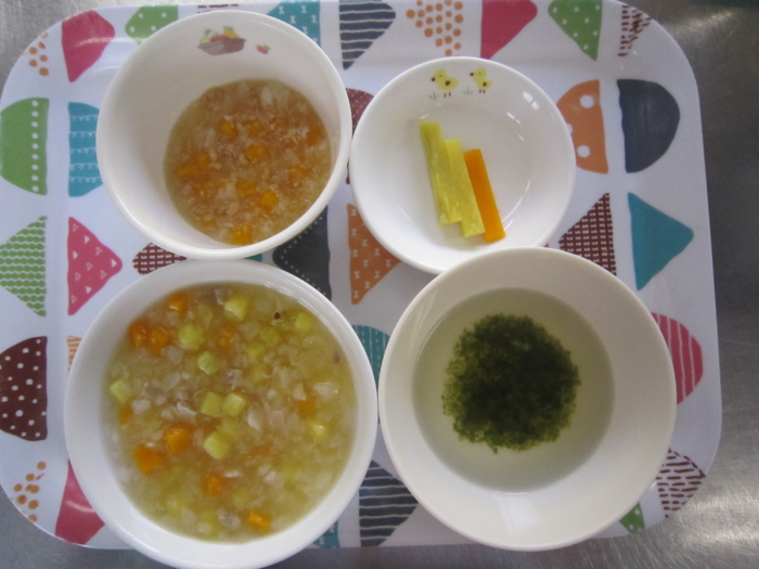 離乳食(後期)は、秋野菜のあんかけ粥、ツナサラダ、わかめのスープ、、さつま芋・人参スティックです。
