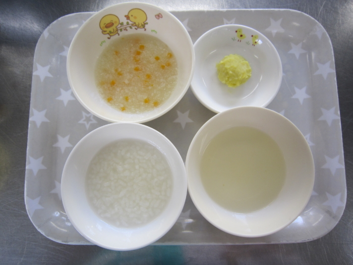 離乳食(中期)は、七倍粥、カレイと野菜のスープ煮、さつま芋とキャベツのマッシュ、野菜スープです。
