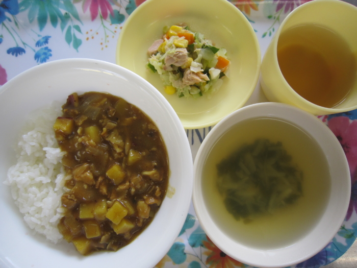今日の給食は、秋野菜カレーライス、ツナサラダ、わかめスープです。