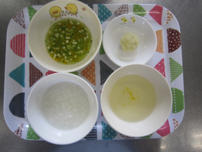 離乳食(中期)は、七倍粥、豆腐と野菜のだし煮、じゃがいもとしらすのマッシュ、野菜スープです。