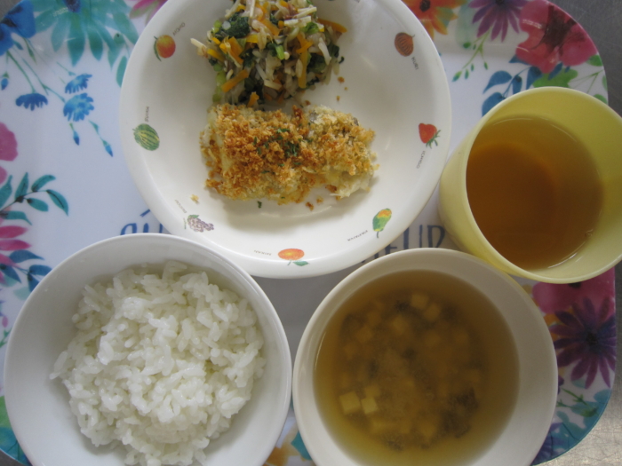 今日の給食は、鱈のパン粉焼き、三食浸し、椎茸のみそ汁、ごはんです。