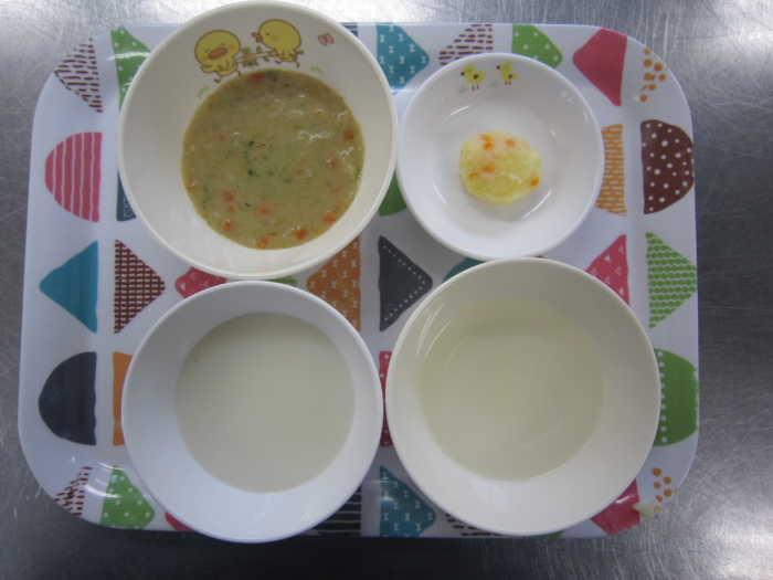 離乳食(中期)は、七倍粥、鮭の豆乳ホワイトソース風、野菜スープ、じゃがいもと人参のマッシュです。