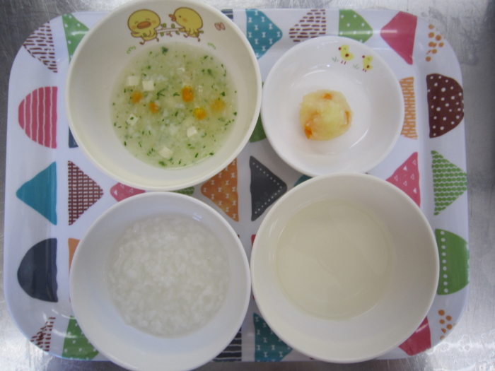 離乳食(中期)は、七倍粥、白身魚と野菜のだし煮、じゃが芋と人参のマッシュ、野菜スープです。
