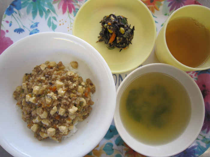 今日の給食は、マーボー丼、ひじきのサラダ、チンゲン菜のスープです。