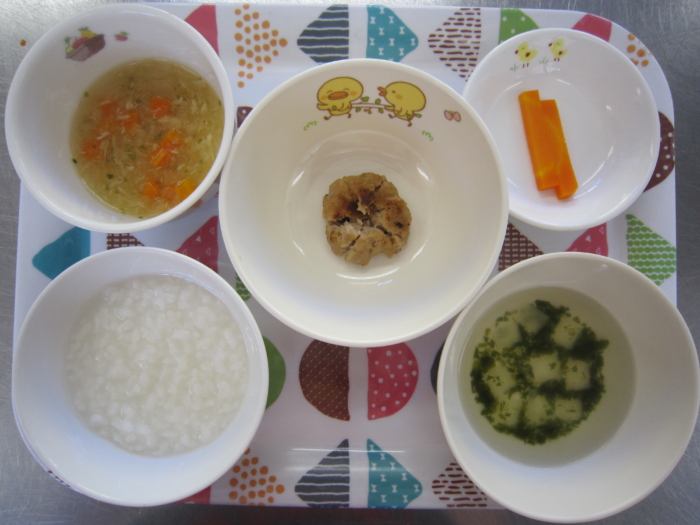 離乳食(後期)は、全粥、ベビーつくね、人参のコロコロサラダ、わかめスープ、人参スティックです。