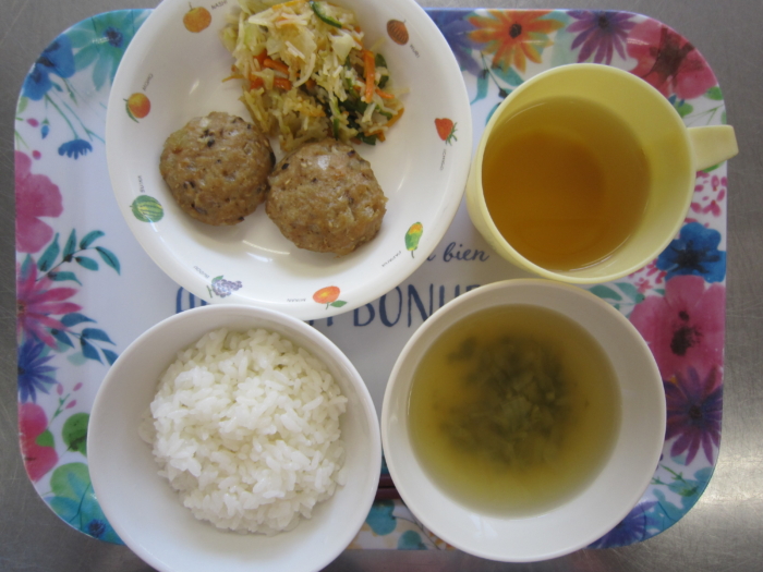 今日の給食は、ごはん、中華つくね、野菜たっぷりビーフン、わかめスープです。