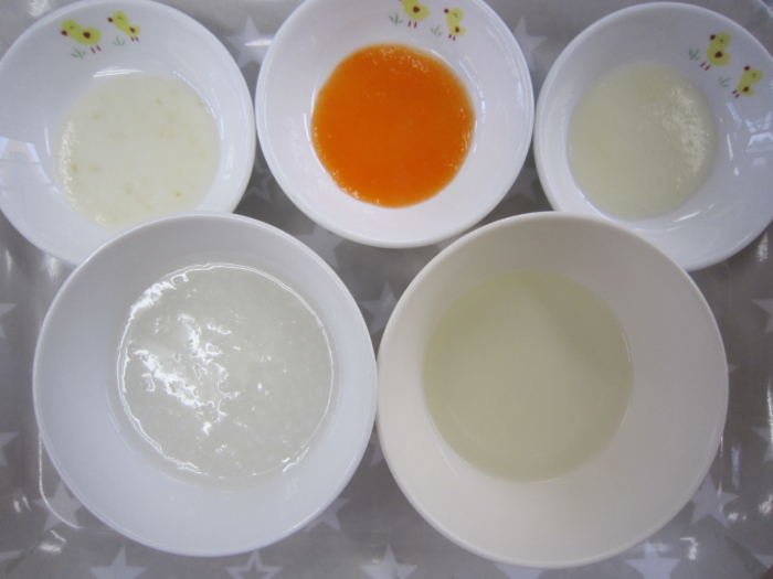 離乳食(初期)は、粒あり粥、じゃが芋ペースト、人参ペースト、白身魚ペースト、野菜スープです。