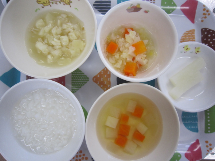 離乳食(後期)は、全粥、白身魚のスープ煮、キャベツの温サラダ、コンソメスープ、大根スティックです。