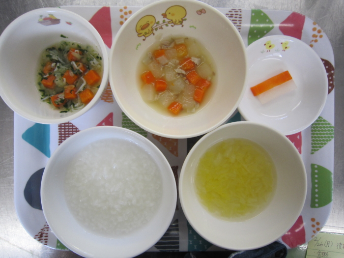 離乳食(後期)は、全粥、鶏肉の五目煮、しらす和え、白菜の味噌汁、大根・人参スティックです。