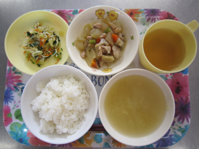 今日の給食は、ごはん、鶏肉の五目煮、しらす和え、白菜の味噌汁です。