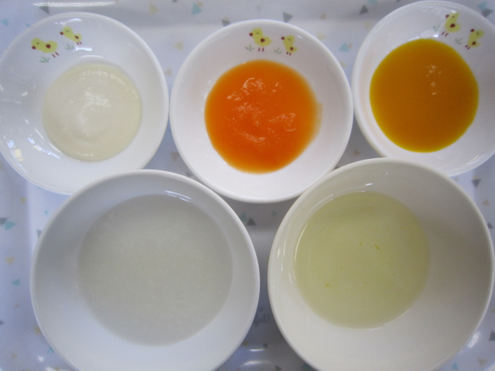 離乳食(初期)は、粒あり粥、南瓜ペースト、人参ペースト、豆腐ペースト、野菜スープです。