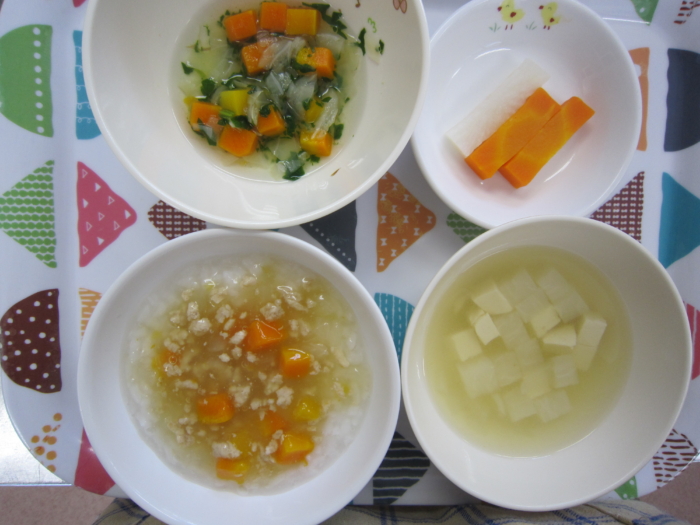 離乳食(後期)は、豚肉のあんかけ粥、三色ナムル、豆腐の味噌汁、人参スティックです。