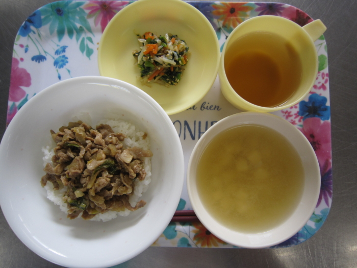 今日の給食は、豚丼、三色ナムル、豆腐の味噌汁です。