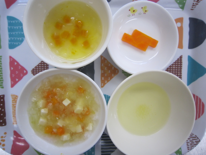 離乳食(中期食)は、豆腐と野菜のあんかけ粥、南瓜と玉ねぎのトロトロ煮、野菜スープ、人参スティックです。
