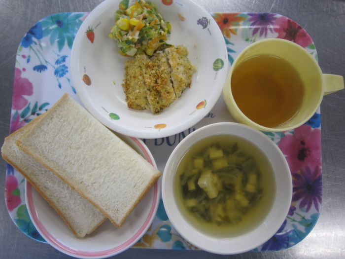 今日の給食は、食パン、鰆のチーズパン粉焼き、人参サラダ、わかめの中華スープです。