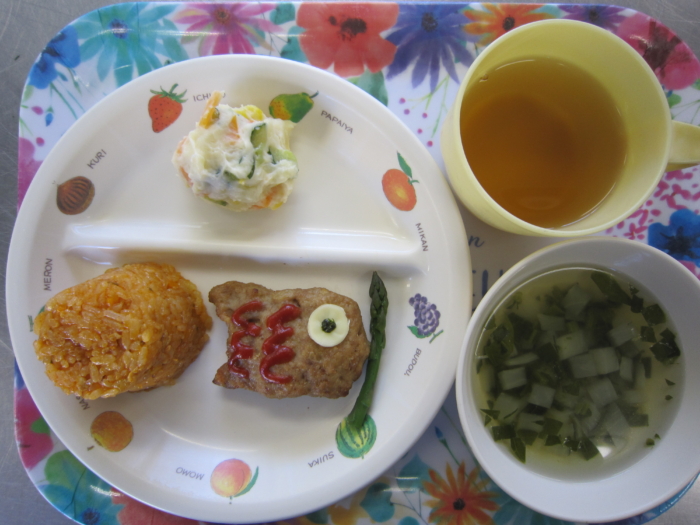 今日の給食は、端午の節句メニューでした。チキンライス、こいのぼりバーグ🎏、ポテトサラダ、コンソメスープです。