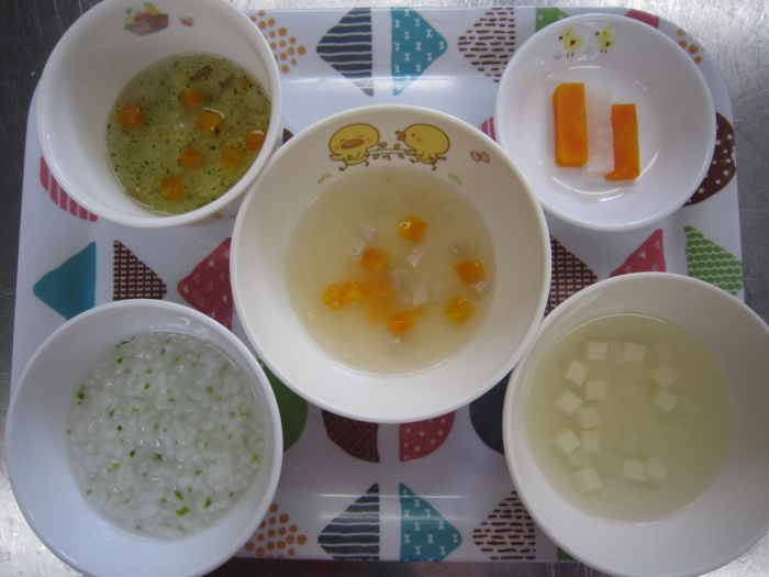 離乳食(後期)は、青のり入り粥、鶏肉の味噌煮、三色浸し、かぶの味噌汁、人参・かぶスティックです。