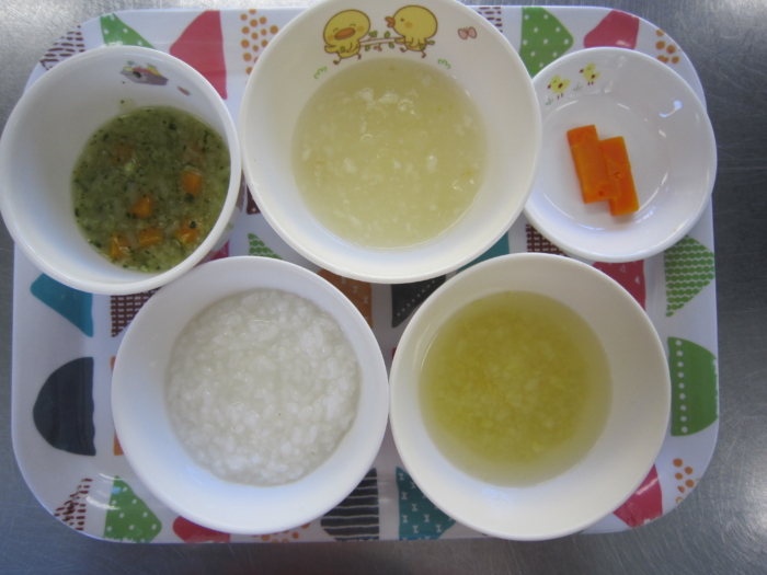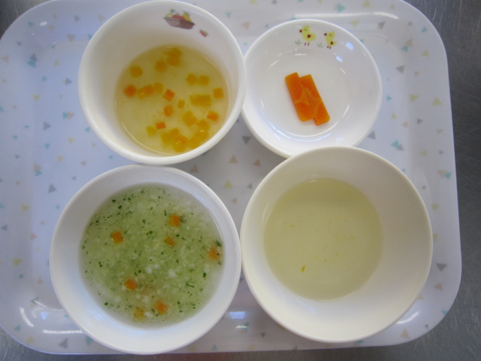 離乳食(中期)は、白身魚と野菜のあんかけ粥、南瓜と人参のトロトロ煮、野菜スープ、人参スティックです。