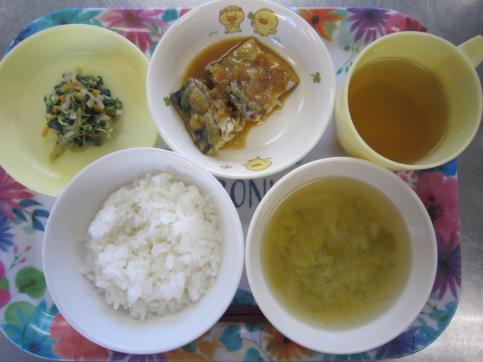 今日の給食は、ごはん、鯖の味噌煮、胡麻和え、キャベツの味噌汁です。