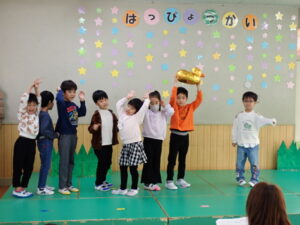 今日は6月生まれのお友だちの誕生会をしました。たまご、ひよこ、りすくみから4人のお友だちが前に出てみんなにお祝いしてもらいました。誕生日のカードをもらったり、誕生日の歌を歌ってもらってうれしそうでしたよ♪先生からのお楽しみはマジックショーでした。魔法の箱に呪文を唱えると、何もなかった箱から魚の飾りや国旗などがでてきて、盛り上がりました☆