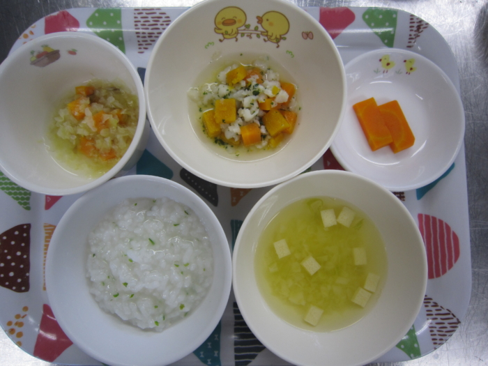 離乳食(後期)は、全粥(青のり入り)、白身魚の旨煮、キャベツのお浸し、豆腐の味噌汁、人参スティックです。