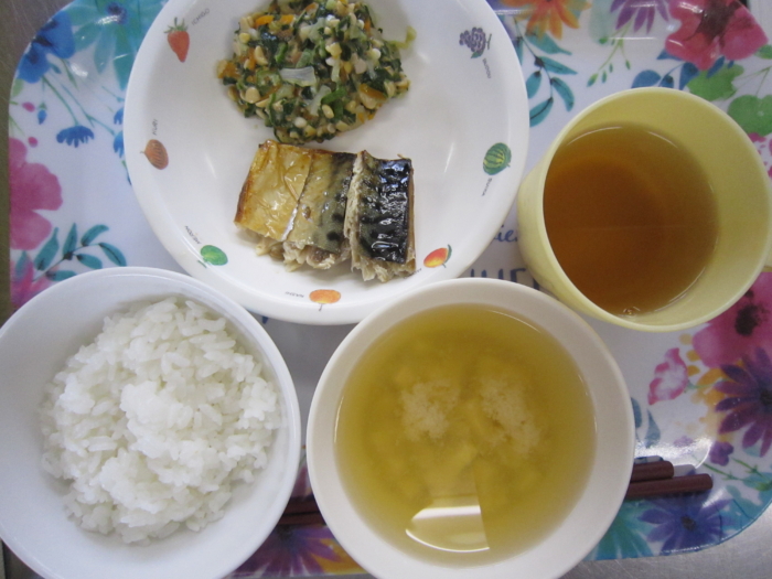 今日の給食は、ごはん、鯖の塩焼き、ネバネバ和え、えのきの味噌汁です。