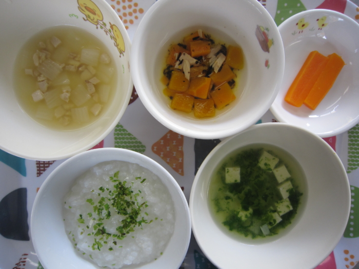 離乳食(中期)は、七倍粥、豆腐と野菜のあんかけ煮、野菜スープ、人参スティックです。