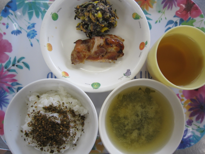 今日の給食は、ミネラルふりかけ、鶏肉の照り焼き、ひじきのサラダ、小松菜の味噌汁です。