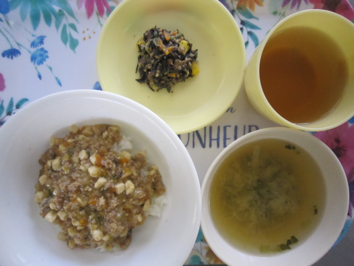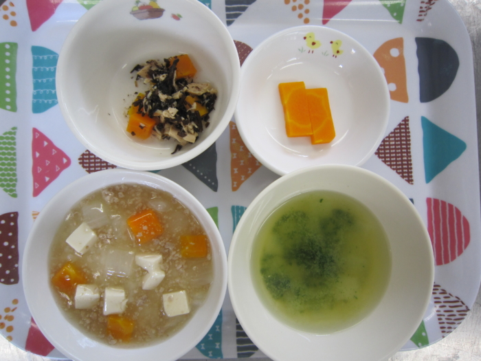 離乳食(後期)は、豆腐とひき肉のあんかけ粥、ひじきのサラダ、小松菜の味噌汁、人参スティックです。