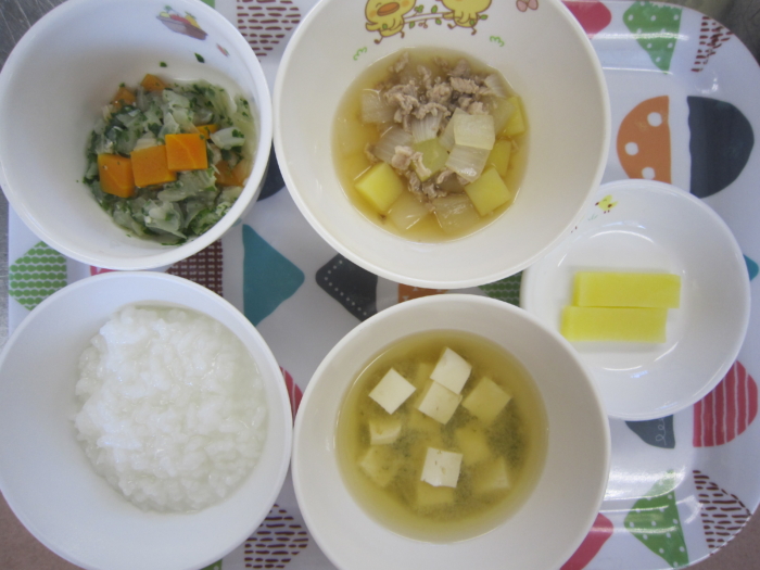 離乳食(後期)は、全粥、豚肉と野菜の煮物、しらす和え、わかめの味噌汁、じゃが芋スティックです。