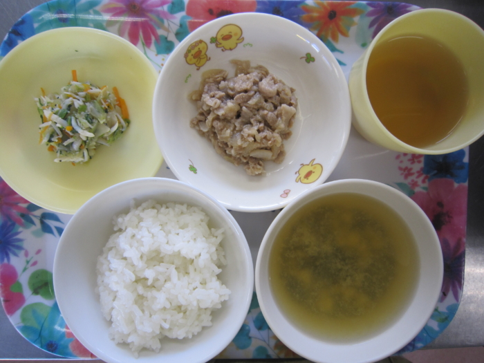今日の給食は、ご飯、豚肉の生姜焼き、しらす和え、わかめの味噌汁です。