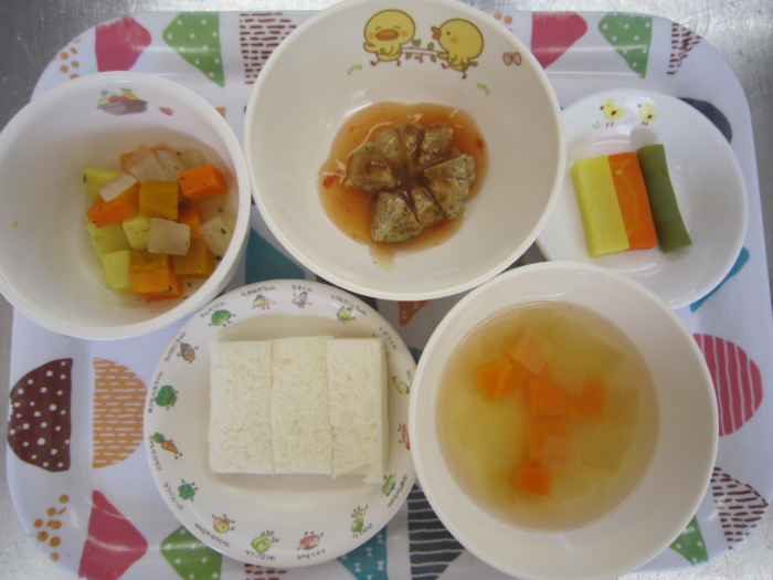 離乳食(後期)は、食パン、ベビー肉団子、コロコロサラダ、オニオンスープ、人参・いんげん・さつま芋スティックです。
