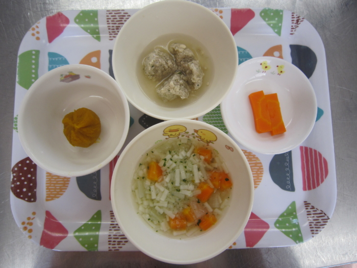 離乳食(後期)は、野菜たっぷり煮込みうどん、ふわふわ肉団子、南瓜の茶巾、人参スティックです。